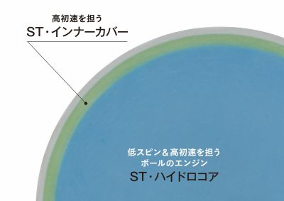 「内軟外硬の特性を維持しながら、コアには耐久性を上げられる新薬品を配合したST・ハイドロコアを開発。インナーカバーには硬質の新素材に無機充填材を配合し、高剛性で高比重のST・インナーカバーを開発。打感をヒントに目覚ましい進化を実現できました」。