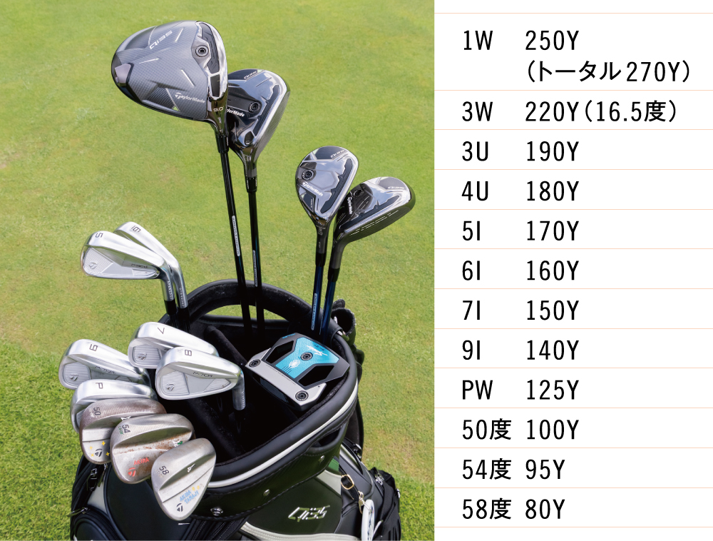 1W:Qi35コアモデル(テーラーメイド)、3W(HL):Qi35(テーラーメイド)、ハイブリッド:Qi35MAX(テーラーメイド)、5I:P8CB(テーラーメイド)、6I-PW:P7CB(テーラーメイド)、50度&58度:MG5ウェッジ(テーラーメイド)、54度:MG4ウェッジ(テーラーメイド)、パター:スパイダーZT(テーラーメイド)、ボール:TP5x(テーラーメイド)
