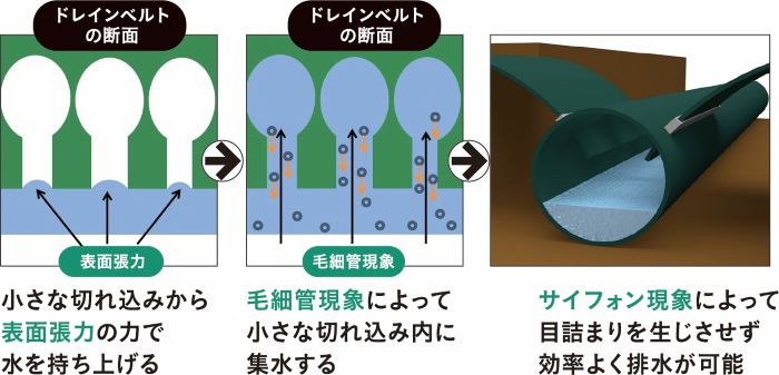 ドレインベルトは幅20cm、厚さ2mmの軽量ゴム板状(素材:軟質ポリ塩化ビニール)の土木排水材。かぎ穴状の小さな切れ込みに表面張力と毛細管現象により集水し、サイフォン現象(高い位置から低い位置に液体が流れる)を利用した暗渠排水工法。水のみの排水が可能で目詰まりを生じさせない。