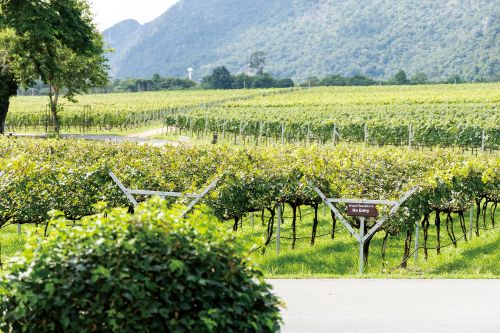 広大な敷地に広がるぶどう畑。12月に実がなり、2月の収穫に至る。カオヤイには「PBバレー・カオヤイ・ワイナリー」と併せて二つの醸造所があり、世界に誇るワインの街である。