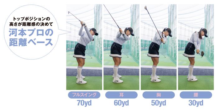 30〜70ヤードを打ち分けるサンドウェッジでは、距離の打ち分けをスイングの強弱で行うのではなく、私は振り幅で調整しています。なぜならリズムを常に一定にできることで、大きなミスになりにくく、さらに精度アップできるから。まずは4つのトップポジションにおいて距離感のベースを作ることを、徹底させましょう。