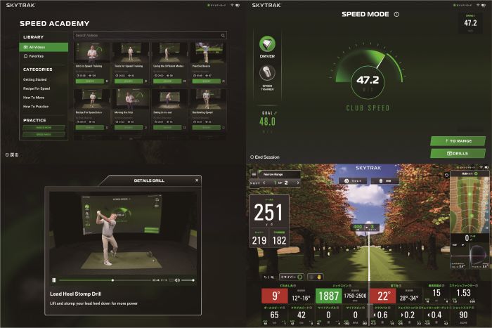 素振りしたときのクラブスピードを表示(右上)。目標スピードに到達しなかったときは複数のドリル、レッスンメニューが紹介される(左上)。GOLFTECのトップコーチ監修のレッスン動画を表示(左下)。左右が狭いことを想定した練習ホールも用意(右下)。