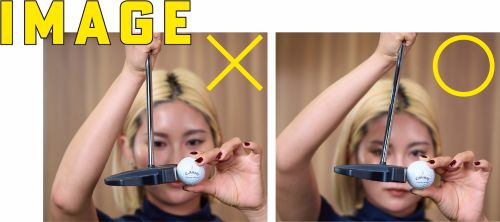 パッティングでは、どんなパターでも「支点」を意識して振ることが再現性の高いストロークを行うためのポイントです。写真のように、みぞおちにスティックを当ててエンドを支点にイメージするだけで、余計な手先の動きを抑え、自然とストロークが安定します。