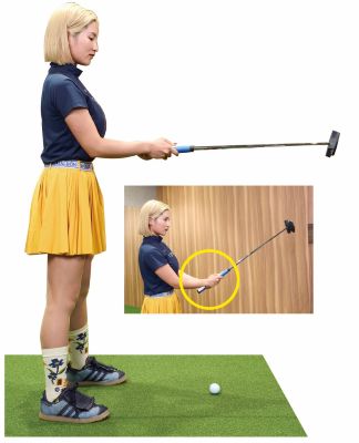 手首を親指側に折って構えてしまうとハンドダウンが強くなりアームローテーション型のストロークになってしまう。トルクフリーパターを使いこなすためには手首に角度を付けないことが肝心だ。
